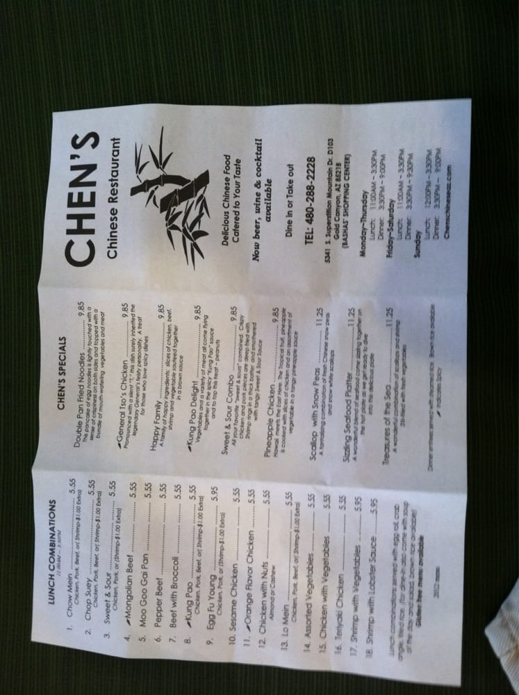 Welcome to Chen’s Chinese Bistro, a hidden gem nestled in Gold Canyon, AZ. This casual eatery specializes in authentic Chinese cuisine, with a menu that spans delightful soups, vibrant seafood dishes, and rich lo mein options. Each dish promises freshness and quality, perfectly encapsulated in customer favorites like the General Tso's Chicken and Kung Pao Chicken.